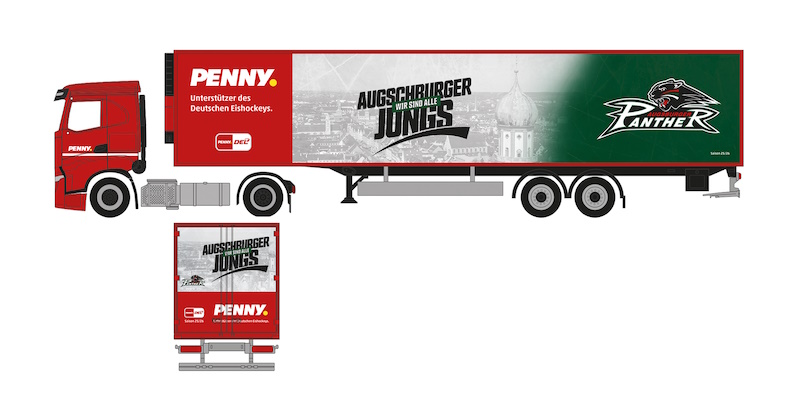 Die PENNY DEL ist die höchste Spielklasse im deutschen Eishockey. Der Titelpartner Penny hatte zur Saison 25/26 die Idee, allen PENNY DEL Clubs die Möglichkeit zu geben, einen eigenen PENNY LKW zu gestalten. Herausgekommen sind 14 wunderschöne Motive, die wir in Zusammenarbeit mit der Liga im Modell entsprechend umsetzen und die bald auch auf den Straßen zu finden sein werden.