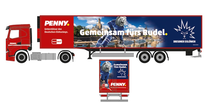 Die PENNY DEL ist die höchste Spielklasse im deutschen Eishockey. Der Titelpartner Penny hatte zur Saison 25/26 die Idee, allen PENNY DEL Clubs die Möglichkeit zu geben, einen eigenen PENNY LKW zu gestalten. Herausgekommen sind 14 wunderschöne Motive, die wir in Zusammenarbeit mit der Liga im Modell entsprechend umsetzen und die bald auch auf den Straßen zu finden sein werden.
