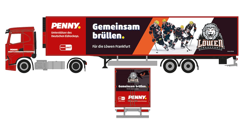 Die PENNY DEL ist die höchste Spielklasse im deutschen Eishockey. Der Titelpartner Penny hatte zur Saison 25/26 die Idee, allen PENNY DEL Clubs die Möglichkeit zu geben, einen eigenen PENNY LKW zu gestalten. Herausgekommen sind 14 wunderschöne Motive, die wir in Zusammenarbeit mit der Liga im Modell entsprechend umsetzen und die bald auch auf den Straßen zu finden sein werden.