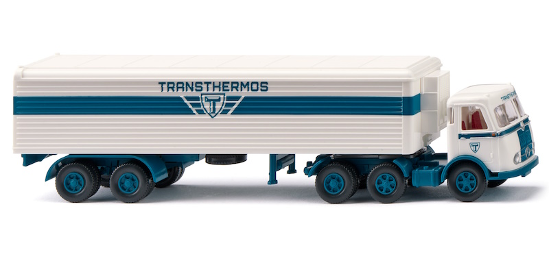 Frontlenker waren bei Transthermos schon früh favorisiert. Kein Wunder also, dass der Mercedes-Benz Pullman einst die damals nagelneue Generation von Kühlkoffern in Dorsay-Optik zog. Da passt bei WIKING zusammen, was zusammengehört. Der Aufliegerzug mit dem Kühlkoffer war einst im Fernverkehr unterwegs, um die Frischware ohne Unterbrechung der Kühlkette zum Ziel zu bringen. In den Farben der Kühllogistiker der Spedition Transthermos fährt der Fernlastzug mit der prägnanten Zwei-Farbgestaltung ins Programm. Besonders auffällig: Die flächig-blauen Gestaltungselemente, die der Pullman-Front zeitgenössischen Charme geben.