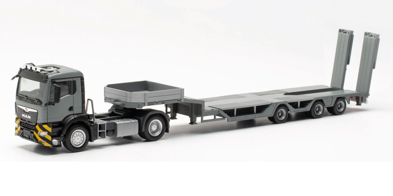 Die grau/gelbe-Baufahrzeugserie wird mit dieser Kombination einer MAN TGS NN 4x4-Allradzugmaschine und des Goldhofer Allrounder fortgeführt. Die Formneuheit des Modells liegt in der neuen Sonnenblende und dem Scheinwerferbügel, die nun auch in der TGS-Reihe in der INDVIDUAL-Ausführung umgesetzt wurden.