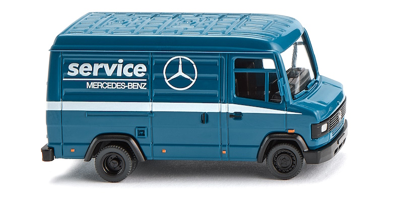 Azurblau-helle Karosserie, schwarzes Fahrgestell mit Kardanteil. Felgen ebenfalls schwarz. Schwarzer Kühlergrill mit silbernem Mercedes-Benz-Stern und silbernen Scheinwerfern. Seitliche Flankengestaltung mit weißem Mercedes-Benz-Stern sowie den Schriftzügen „Service“ und „Mercedes-Benz“. Umlaufende weiße Bauchbinde.