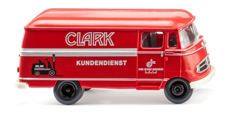 Karosserie korallenrot, Inneneinrichtung mit Lenkrad anthrazitgrau. Fahrgestell mit Kardanwelle weiß, schwarze Felgen. Schwarze Kühlergrillbedruckung mit gesilberten Zierleisten und Mercedes-Benz-Stern. Umlaufende Zierleisten. Weiße Türbedruckung mit Logo und Schriftzug Ruhr-Intrans. Seitliche Bedruckung mit weißem Clark-Schriftzug und Kundendienst-Hinweis sowie Stapler-Silhouettenzeichnung. Frontscheinwerfer per Hand gesilbert.