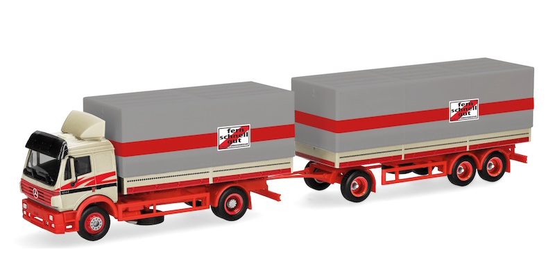 Mit der Beschriftung „FERN SCHNELL GUT“ und als Gliederzug mit zweiachsigem Motorwagen und dreiachsigem Hänger mit Planenaufbauten fuhr das Fahrzeug seinerzeit.