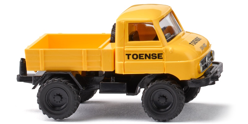 Fahrerhaus mit Pritsche zinkgelb. Inneneinrichtung mit Lenkrad, Fahrgestell und Felgen schwarz. Kühlergrill mit Zierleisten, Unimog-Schriftzug und Mercedes-Benz-Stern silbern bedruckt. Schwarzer Toense-Schriftzug auf Motorhaube und auf den Kabinentüren.