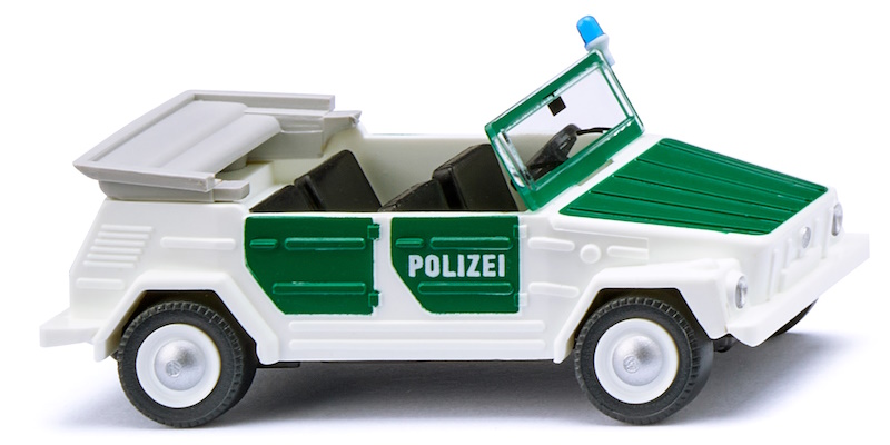 Karosserie und Felgen weiß, Buckelkappen silbern abgesetzt, Fahrgestell mit Lenkrad und Inneneinrichtung schwarz. Offenes Verdeck lichtgrau. Minzgrün bedruckte Flächen mit weißem Polizei-Schriftzug. Rücklichter karminrot, Frontscheinwerfer per Hand silbern koloriert. Weißes Stangenblaulicht auf der Fahrerseite mit blautransparenter Leuchte. Scheibenrahmen minzgrün bedruckt, schwarze Scheibenwischer und Rückspiegel.