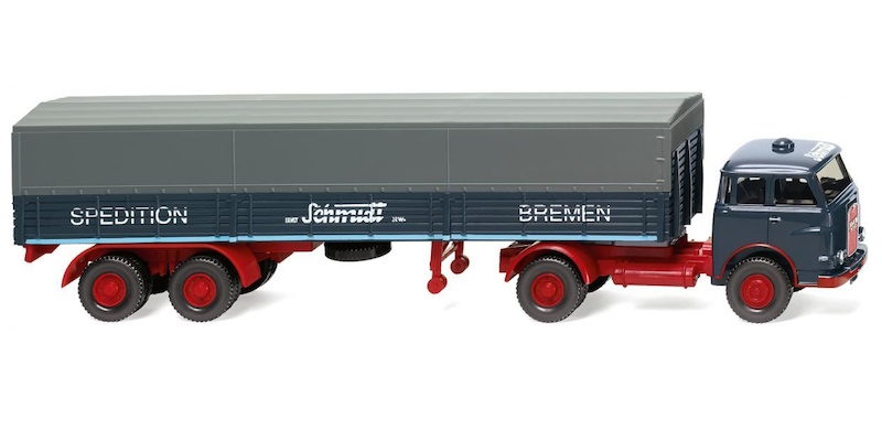 Fahrerhaus graublau, karminroter Kühlergrill mit gesilbertem MAN- und Diesel-Schriftzug. Inneneinrichtung schwarz. Fahrgestell sowie Felgen karminrot. Stoßstangenbedruckung und Radkastenkanten karminrot. Scheinwerfer per Hand gesilbert. Seitlich silberne Bedruckung von Türgriffen sowie Zierlinien. Graublauer Auflieger mit mausgrauer Plane sowie silbergrauem Einlegeboden. Karminrotes Fahrgestell mit Stützrollen. Weißer „Schmidt“-Schriftzug am Dach. Seitliche und hintere Pritschenbedruckung mit weißem „Schmidt“- und „Bremen“-Schriftzug.