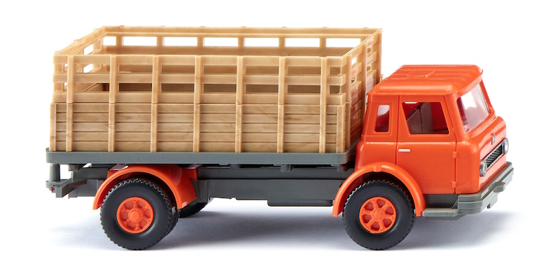 Fahrerhaus verkehrsorange, Inneneinrichtung mausgrau. Fahrgestell und Plattform mausgrau. Kühlergrill silber. Gitteraufbau holzfarben changierend. Logo und Schriftzug International Harvester silbern bedruckt. Seitliche Türgriffe gesilbert. Schwarz abgesetzte Kühlergrillfläche mit silbernen Scheinwerfern. Rückleuchten rot bemalt.