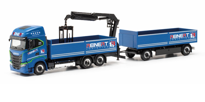 Nach knapp dreijähriger Pause erscheint wieder ein Modell von Reinert Logistic aus dem sächsischem Schleife, Ortsteil Mulkwitz. Dieser Baustoffhängerzug mit Iveco S-Way ist bereits mit dem aktuellen Logo der Spedition bedruckt, welches sich leicht verändert hat. Nahezu der komplette Fuhrpark läuft mittlerweile mit Zugmaschinen und LKWs des italienischen Nutzfahrzeugherstellers. Das Modell erscheint in einer einmaligen Auflage.
