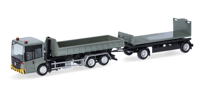 Mercedes-Benz Econic Wechsellader-Hängerzug mit flacher Mulde und Flat, grau-gelb
