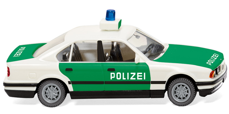 Karosserie weiß, Inneneinrichtung, Fahrgestell und Stoßstangen schwarz. Weiße Lautsprecherbox mit blautransparent aufgestecktem Warnlicht. Felgen silbern. Blinker vorn orangetransparent, Rückleuchten rottransparent eingesteckt. Vordere Scheinwerfer silbern bemalt. Motorhaube sowie Türen und Kofferraum minzgrün bedruckt mit weißem Polizei-Schriftzug. Motorhaube mit silbernem BMW-Logo und gesilberter BMW-Niere auf dem Kühlergrill. Seitliche Zierstreifen, Türgriffe und B-Säule schwarz gehalten. Heckseitig gesilbertes BMW-Logo