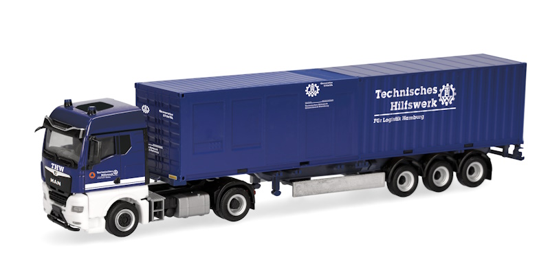 Neu beim Technischen Hilfswerk THW ist diese MAN TGX GM Zugmaschine, die Herpa als Miniaturmodell mit einem Containerchassis produziert. Beladen ist der Auflieger mit einem 20 ft. Boxcontainer sowie einem 20 ft. Stromaggregat-Container.