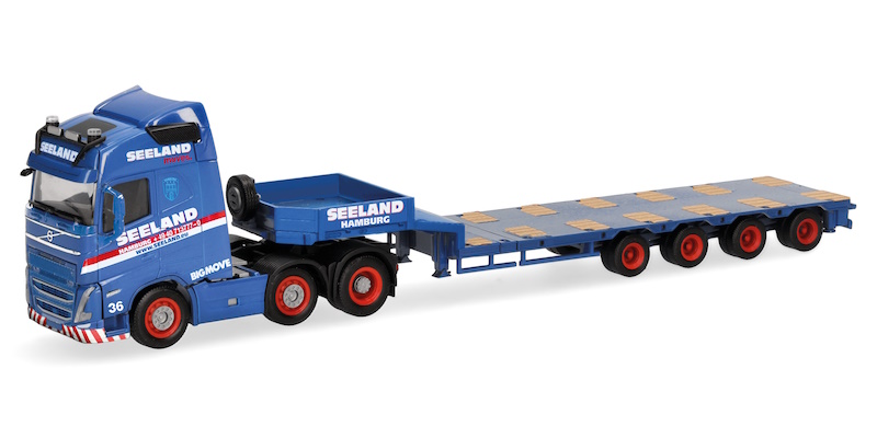 Nach dem spektakulären Modell des Tiefladers mit der Fußgängerbrücke für das Miniaturwunderland in Hamburg als Ladung erscheint bei Herpa das zweite Modell des Schwertransport-Spezialisten Seeland.
