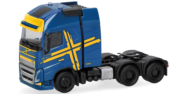 Bedruckt mit dem gelben "Schweden-Design" sowie einer farblich passenden Sonnenblende wird von Herpa diese dreiachsige Volvo-Zugmaschine mit Schwerlastturm neu gefertigt.