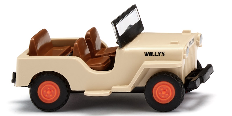 Karosse elfenbeinbeige, Fahrgestell schwarz. Sitz lehmbraun, Lenkrad schwarz eingesteckt. Felgen orange. Frontscheinwerfer gesilbert, "Willys"-Schriftzug schwarz bedruckt.