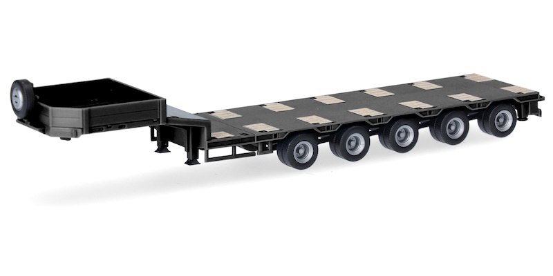 Als Farbneuheit wird der fünfachsige Tieflade-Auflieger nach Goldhofer-Vorbild künftig mit einem anthrazitfarbenen Aufbau gefertigt.
