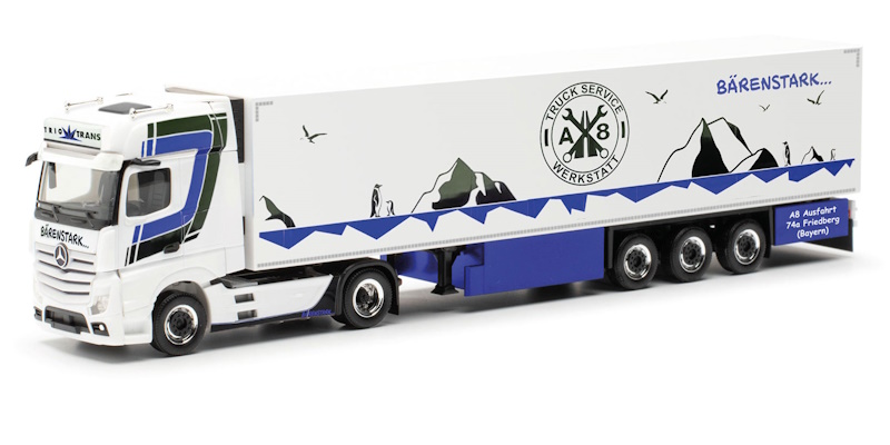 Eine Vielzahl an Modellen wurden bereits von Trio-Trans aus dem bayerisch-schwäbischen Friedberg bei Augsburg umgesetzt. Dieser Sattelzug ist einer der jüngsten im Fuhrpark und zeigt seitlich des gewohnte Bild der Eislandschaft mit Pinguinen. Eine zusätzliche Beklebung weist auf den hauseigenen „Truck Service“ (ebenso wie das komplette Heck) hin. Das Modell erscheint in einmaliger Auflage.
