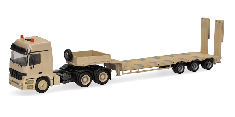 Auf Auslandseinsätzen ist mit seiner sandbeigen Farbgebung dieser dreiachsige Mercedes-Benz Actros der ersten Generation mit einem farblich passenden Tiefladeauflieger bei der belgischen Armee im Einsatz.
