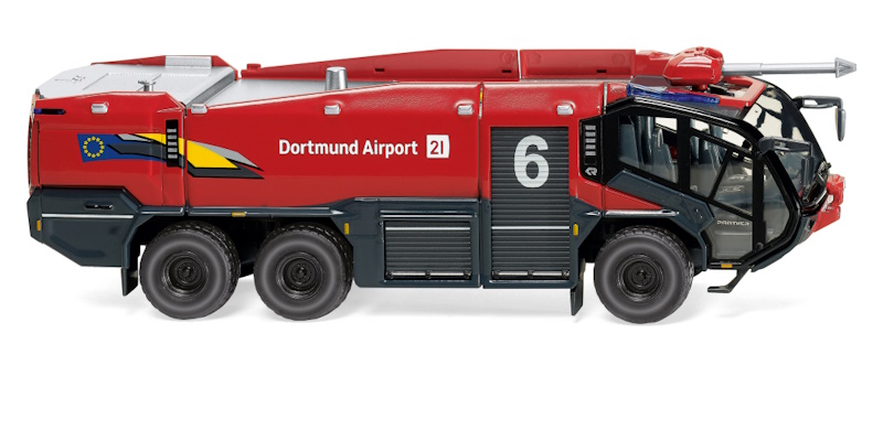 Es war das erste Fahrzeug der neuesten Panther-Generation in Deutschland, das Rosenbauer am Dortmunder Flughafen übergeben konnte. Mit der Ziffer „6“ auf den Flanken wird er künftig für Sicherheit sorgen und war damit ein willkommenes Vorbild für das größte und aktuellste WIKING-Flugfeldlöschfahrzeug. Der Panther hat einen umweltfreundlichen Euro 6-Motor mit 750 PS und beschleunigt in nur 29 Sekunden von 0 auf 80 km/h, die Höchstgeschwindigkeit liegt bei 120 km/h. 12.500 Liter Wasser, 1.500 Liter Schaum, 250 Kilogramm Pulver und 120 Kilogramm Kohlenstoffdioxid (CO2) finden in dem roten Riesen Platz. Leistungsstarke Pumpen im Fahrzeug sorgen dafür, dass bis zu 6.000 Liter Löschmittel pro Minute durch den Dachmonitor ausgebracht werden. Seine Wurfweite liegt bei ca. 100 Metern. Der neue Panther 6x6 ersetzte am Dortmund Airport seinen 17 Jahre alten Vorgänger. Mit dem Neuzugang verfügt die Flughafenfeuerwehr über drei Flugfeldlöschfahrzeuge des Rosenbauer Panthers. Die neue Rosenbauer-Generation des Panthers 6x6 zeigt, was sich im Vergleich zum revolutionären Vorgänger verändert hat. Um den Einsatzkräften noch mehr Sicherheit, Nutzungs- und Bedienkomfort sowie Löschleistung zu bieten, hat Rosenbauer den neuen Panther 6×6 mit innovativen Features und mit maximaler Leistung, Sicherheit und Funktionalität ausgestattet. So wurde besonderes Augenmerk auf höchste Fahr- und Fahrzeugsicherheit, maximalen Nutzungs- und Bedienkomfort sowie optimale Fahrperformance gelegt. Auch im Modell wird die neue Linie des erhabenen Aufbaus gleich hinter der futurischen Sicherheitskabine deutlich – natürlich im authentischen Design des Dortmunder Airports. Transparente Kabine mit schwarzbedruckten Begrenzungen, Aufbaumittel- und -heckteil rot. Frontseitige Warnlichter blautransparent, frontseitiger Monitor anthrazitgrau. Seitliche Jalousien anthrazitgrau. Inneneinrichtung mit Armaturenbrett und Lenkrad blaugrau. Dachmonitor silber. Heckseitig schwarzgraue Karosserie. Fahrgestell mit Kardanteil anthrazitgrau. Felgen schwarz. Seitlicher Schriftzug „Dortmund Airport“ mit Flaggendesign. Auf den Jalousien weiße Einsatzfahrzeugnummer „6“.