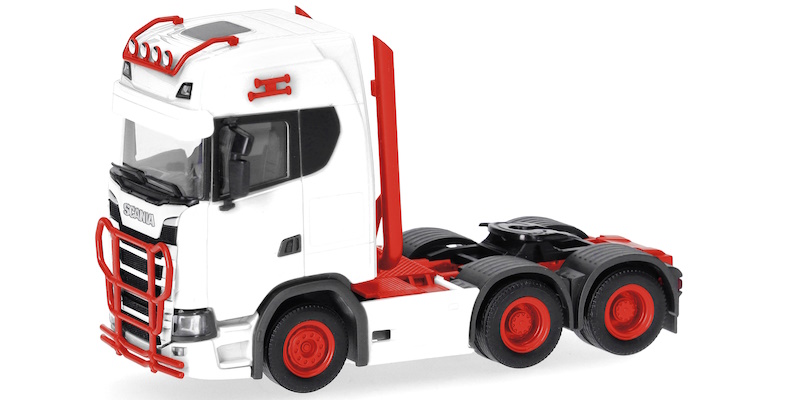 In einer außergewöhnlichen Farbgebung erscheint die dreiachsige Scania CS 20 Zugmaschine.